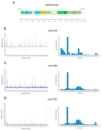 Viral small RNA profiles of U4.4 cells after LamV infection. (A) Schematic representation of the LamV genome and vsRNA profiles at 24 h (B), 48 h (C), and 72 h (D) p.i. Figures to the left show vsRNA reads along the LamV genome as a histogram. The positive values (blue) are counts of sRNAs mapped to the sense strand, and the negative values (red) are those mapped to the antisense strand. Figures to the right show the size distribution of reads that mapped to the LamV genome.