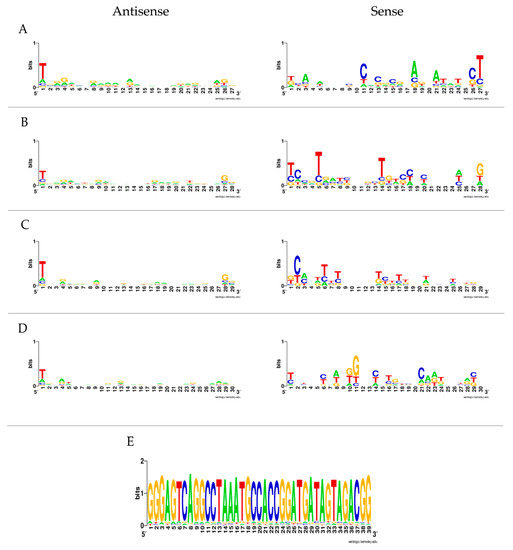 Nucleotide biases of the 27–30 and 39 nt long reads at 72 h p.i. of LamV. The sequences are in DNA format, so U is written as T. Reads derived from the antisense are shown in the left panel. Reads derived from sense strand are shown in the right panel: (A) 27 nt reads, (B) 28 nt reads, (C) 29 nt reads, (D) 30 nt reads, and (E) 39 nt long reads from the fourth hotspot in the LamV genome.