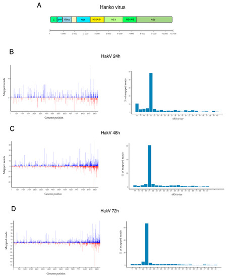 The results from HakV-infected U4.4 cells showed a slightly higher production of vsRNAs at 24 h p.i. compared to LamV-infected cells, where 0.01% (n = 1296) of the reads mapped to the HakV genome. The observed proportion of vsRNAs was similar at 48 h p.i., 0.06% (n = 7324), and lower at 72 h p.i., 0.08% (n = 11,179) compared to LamV-infected cells. Moreover, when analyzing the read length distribution, a high proportion of the reads was in the size range of siRNA (21 nt), with 48.4% observed at 24 h p.i, 60.9% observed at 48 h p.i., and 66.5% observed at 72 h p.i. The shoulder of piRNAs (27–30 nt) observed in the LamV-infected cells was absent in those cells infected with HakV (Figure 5). The lack of vpiRNA suggests that HakV does not trigger the proteins responsible for vpiRNA amplification such as Ago3 and PIWI-5. An analysis of the read alignment showed that the vsRNA mapped across the entire HakV genome, with slightly more coverage observed at the 3′ end (7840–10,158 nt), which corresponded to the RNA-dependent RNA polymerase (NS5) gene region. The strand polarity showed a more even distribution between sense (68.6%) and antisense (31.4%) compared to LamV-infected U4.4 cells.