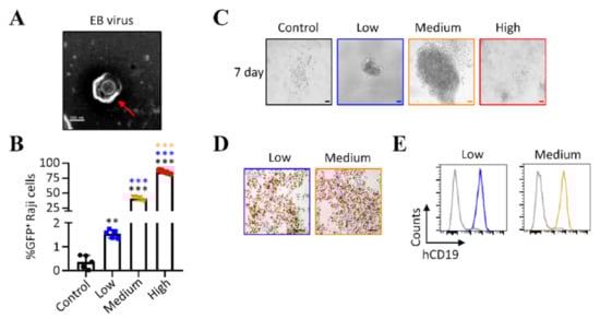 We first explored the influence of virus doses on the outcome of EBV infection in human primary B cells by using different numbers of GRUs of Akata-EBV-GFP. Akata-EBV-GFP was generated in CNE2-EBV cells as described [,], and the virions were identified by transmission electron microscopy (Figure 1A). We determined the concentration of GFP-transducing virions as green Raji units (GRUs), since Akata-EBV-GFP encodes the green fluorescence protein (GFP) under the control of the SV40 enhancer and promoter. Raji B cells were infected with serial dilutions of virus stocks, and the percentage of GFP-positive cells was determined by flow cytometry, and used to calculate the absolute number of infected cells in each sample [,,]. In this study, three different infectious titers of EBV (high (8.5 × 104 GRUs/mL), medium (4.1 × 104 GRUs/mL), and low (1.5 × 103 GRUs/mL)), determined by the detection of GFP+ Raji B cells (Figure 1B), were used to infect human primary B cells, and to test for transformation in vitro. Microscopy observation showed clear signs of outgrowth of lymphoblastoid cells seven days after infection with low and medium doses of Akata-EBV-GFP (Figure 1C). In contrast, mock-infected primary B cells or cells infected with high doses (8.5 × 103 GRUs) of the virus were almost all dead. Four to five weeks following infection with low and medium doses (GRUs) of Akata-EBV-GFP, cell outgrowth was universally EBV-positive, as detected by EBER in situ hybridization (Figure 1D). Flow cytometry analysis confirmed that cell outgrowth was CD19-positive B cells in both conditions (Figure 1E). Together, these results showed that infection of 1 × 105 cells primary B cells by low (1.5 × 102 GRUs) and medium (4.1 × 103 GRUs) doses of Akata-EBV-GFP leads to growth transformation of B cells in vitro, whereas high doses (8.5 × 103 GRUs/mL) of Akata-EBV-GFP has a lethal effect on primary B cells.