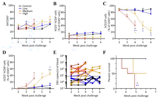 EBV infection in humanized mice. (A–D) The frequency of (A) hCD45+, (B) hCD3+hCD4+, (C) hCD19+, and (D) hCD3+hCD8+ cells in peripheral blood at the indicated time points post-challenge. hCD3+hCD4+, hCD19+, and hCD3+hCD8+ cells were pre-gated on the mCD45-hCD45+ human cell population. Data points represent the mean ± SEM of uninfected control mice (n = 3), low (n = 5), medium (n = 6), high (n = 6) doses (GRUs) of Akata-EBV-GFP infected mice. * p < 0.05, ** p < 0.01 (E) Viral DNA was quantified in the peripheral blood of uninfected control mice (n = 3) and mice that received low (n = 5), medium (n = 6), and high (n = 6) doses (GRUs) of Akata-EBV-GFP. Data are shown as the mean of three biological replicates for each mouse. Each dot represents an individual mouse, and the dotted line indicates the limit of detection. (F) Survival of mice was monitored weekly after infection with different infectious doses of the virus (control (n = 3), low (n = 5), medium (n = 6), and high (n = 6) doses (GRUs) of Akata-EBV).