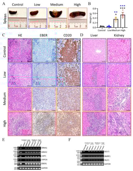 To study the influence of different virus doses on tissues, we collected the spleens, livers, and kidneys of mice at the time of necropsy. Irregular and pale tumors were observed in spleens of mice that were inoculated with high and medium doses (GRUs) of the virus, and there was no visible difference in the spleens in the other two groups (Figure 3A). Splenomegaly was also significant in mice that received medium and high doses of Akata-EBV-GFP (Figure 3A,B). Immunohistochemical analysis showed that most hCD20-positive cells were EBER-positive cells in the spleens of mice that received medium and high doses (GRUs) of the virus, whereas only parts of hCD20-positive cells were EBER-positive cells in the spleens of mice that received low doses (GRUs) of the virus (Figure 3C). Marked infiltration of transformed lymphoid cells was also observed in the livers and kidneys (Figure 3C). The level of infiltration appeared to be related to the dose of virus inoculum (Figure 3D). The spleens of control mice were negative for EBER, and no transformed lymphoid cells were observed in the livers and kidneys. RT-PCR analysis of the spleens from control mice or mice inoculated with a low dose (GRUs) of the virus, or tumors obtained from mice inoculated with high and medium doses (GRUs) of the virus showed expression of EBNA1, EBNA2, LMP1, LMP2A, and EBER, consistent with the latency III gene expression program (Table S1, Figure 3E). We also identified the transcripts from lytic-cycle genes, including immediate-early gene BZLF1, early gene BMLF1, and late gene BLLF1 (Figure 3F).