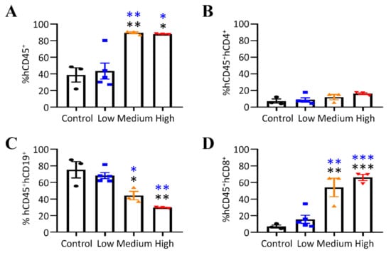 Splenic lymphocytes were analyzed in EBV-infected humanized mice. (A–D) The frequency of (A) hCD45+, (B) hCD45+hCD4+, (C) hCD45+hCD19+, and (D) hCD45+hCD8+ cells in spleens at the study endpoint. Data points represent mean ± SEM of uninfected control mice (n = 3), low (n = 5), medium (n = 3), high (n = 3) doses (GRUs) of Akata-EBV-GFP infected mice, * p < 0.05, ** p < 0.01, *** p < 0.001.