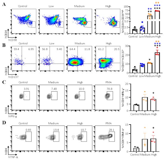 It has been shown that the percentage of CD24-CD38high cells was significantly higher in high EBV patients and humanized mice inoculated with 3.3 × 104 GRUs of Akata-EBV-GFP when compared with healthy controls or control group mice [,]. Our results also showed that the hCD24-hCD38high population was significantly expanded in the spleens of mice inoculated with medium and high doses (GRUs) of Akata-EBV-GFP when compared with the control group and mice that received low doses (GRUs) of the virus (Figure 5A). The percentage of CD8+ T cells tended to increase with the dose of the virus, thus, we next evaluated the percentage of activated hCD8+ T cells in different groups. Interestingly, there was a significant increase in the percentage of activated hCD8+ T cells in in the spleens of mice infected with medium and high doses (GRUs) of the virus (Figure 5B). We further explored whether the activated hCD8+ T cells (hCD69+hCD137+ T cell) were specific for EBV. We first isolated the hCD8+hCD69+hCD137+ T cells and hCD19+ B cells from the same spleens of mice infected with medium and high doses (GRUs) of the virus. The hCD8+hCD69+hCD137+ T cells were stimulated with EBV-infected hCD19+ B cells, and the frequencies of IFN-γ- or TNF-α-producing CD8+ T cells were determined by intracellular cytokine staining (ICS). EBV-infected hCD19+ B cells stimulated more than 4% (background-subtracted mean value) of the hCD8+hCD69+hCD137+ T cells to secrete IFN-γ or TNF-α (Figure 5B,C). These results indicate that the hCD8+ T cells are getting activated by human B cells following EBV infection in a dose-dependent manner, and a small part of hCD8+hCD69+hCD137+ T cells are EBV-specific CD8+ T cells.