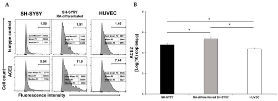(A) Flow cytometry analysis of ACE2 expression in SH-SY5Y (left), RA-differentiated SH-SY5Y (middle), and HUVEC (right) cells. Both SH-SY5Y and HUVEC cells were stained with the specific antibody for the receptor (bottom) or the corresponding isotype control (top). The data related to the fluorescent intensity are also indicated in the figure. A representative of three different experiments is shown. (B) mRNA expression levels of ACE2 in both SH-SY5Y and RA-differentiated SH-SY5Y and HUVEC cells. Experiments were done in duplicates. Copy number per µg of mRNA is indicated. * p < 0.05.