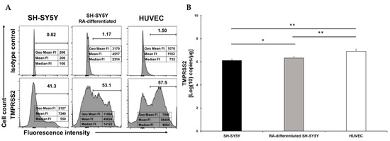 (A) Flow cytometry analysis of TMPRSS2 expression in SH-SY5Y (left), RA-differentiated SH-SY5Y (middle), and HUVEC (right) cells. Both SH-SY5Y and HUVEC cells were stained with the specific antibody for the receptor (bottom) or the corresponding isotype control (top). The data related to the fluorescent intensity are also indicated in the figure. A representative of three different experiments is shown. (B) mRNA expression levels of TMPRSS2 in both SH-SY5Y and RA-differentiated SH-SY5Y and HUVEC cells. Experiments were done in duplicates. Copy number per µg of mRNA is indicated. * p < 0.05 and ** p < 0.01.