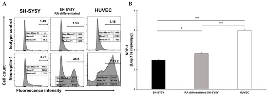 (A) Flow cytometry analysis of NRP1 expression in SH-SY5Y (left), RA-differentiated SH-SY5Y (middle), and HUVEC (right) cells. Both SH-SY5Y and HUVEC cells were stained with the specific antibody for the receptor (bottom) or the corresponding isotype control (top). The data related to the fluorescent intensity are also indicated in the figure. A representative of three different experiments is shown. (B) mRNA expression levels of NRP1 in both SH-SY5Y and RA-differentiated SH-SY5Y and HUVEC cells. Experiments were done in duplicates. Copy number per µg of mRNA is indicated. * p < 0.05 and ** p < 0.01.