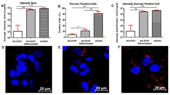 Entry of PV-SARS-CoV-2-S-(D614G)-VSV-△G-mCherry in SH-SY5Y (A–D), RA-differentiated SH-SY5Y cells (B–E), and HUVEC cells (C–F). Upon infection with the pseudovirus carrying the Spike with the D614G mutation, images were acquired after 24 h post-infection. The average intensity sum of the signal (A), the number of positive cells (B), and the average intensity sum of the signal/positive cell (C) were calculated for both SH-SY5Y and RA-differentiated SH-SY5Y and HUVEC cells. Results represent the mean and SEM of 10 different locations in each well. Representative images of SH-SY5Y cells (D), RA-differentiated SH-SY5Y cells (E), and HUVEC cells (F) show the viral entry. DAPI-staining was used for nuclei detection. Scale bar: 20 µm. * p < 0.05 and ** p < 0.01, calculated using a two-tailed Student’s t-test. A representative of three different experiments is shown.