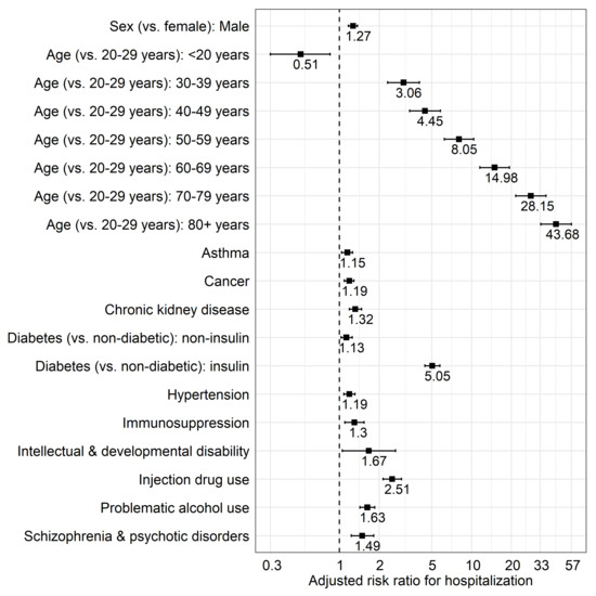 In the adjusted multivariable Poisson regression model (Table 2; Figure 1), age (p-trend < 0.0001 across age groups with increasing risk with older age [aRR 30–39 years = 3.06; 95% CI = 2.32–4.03, to aRR 80+ years = 43.68; 95% CI = 33.41–57.10 compared to 20–29 years-old]), male sex (aRR = 1.27; 95% CI = 1.17–1.37), asthma (aRR = 1.15; 95% CI = 1.04–1.26), cancer (1.19; 95% CI = 1.09–1.29), CKD (RR = 1.32; 95% CI = 1.19–1.47), diabetes (treated without insulin aRR = 1.13; 95% CI = 1.03–1.25, requiring insulin aRR = 5.05; 95% CI = 4.43–5.76), hypertension (aRR = 1.19; 95% CI = 1.08–1.31), immunosuppression(1.30; 95% CI = 1.10–1.54), IDU (aRR = 2.51; 95% CI = 2.14–2.95), IDD (aRR = 1.67; 95% CI = 1.05–2.66), problematic alcohol use (aRR = 1.63; 95% CI = 1.43–1.85) and SZP (aRR = 1.49; 95% CI = 1.23–1.82) were associated with increased hospitalization risk. The analysis by time period (Supplementary Tables S2 and S3) did not show any remarkable differences in risk factors.