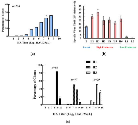 Clonal variation of parental MDCK cells. (a) clonal HA titer distribution of parental MDCK cells. (b) specific virus yield of selected high- or low-producing clones. Red: High-producing clones, blue: Parent cells, green: Low-producing cells. Experiments were done in triplicated infections. (c) HA titer distribution of H1, H2, and H3 subclones after an 80-day passage. * indicates HA titer of the pool.
