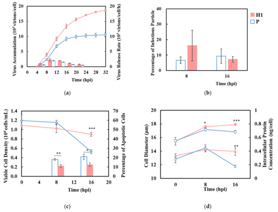 A synchronized single-cycle infection was performed on H1 and P using a high MOI of 10 to ensure that all cells received the virus upon infection [29]. The virus began to emerge in both H1 and P after 4 hpi, reaching a plateau by 16 hpi when the viability became low in P, while continuing at a slower rate until 32 hpi in H1 (Figure 2a,c). Approximately 19,000 virions were released per cell by 32 hpi in H1, which was almost twice that of P. Both H1 and P reached their highest virus release rate between 8–16 hpi (Figure 2a). The proportion of infectious particles in the total virus was ~10%, as assessed by TCID50 for both H1 and P (Figure 2b). The increased HA titer in H1 was not at the expense of infectious virion. After virus infection, cell viability decreased, while the percentage of apoptotic cells, cell diameter, and intracellular protein levels increased in both H1 and P. H1 sustained a high viability for longer and maintained a larger cell size, higher intracellular proteins level and a lower extent of apoptosis until 16 hpi (Figure 2c,d).
