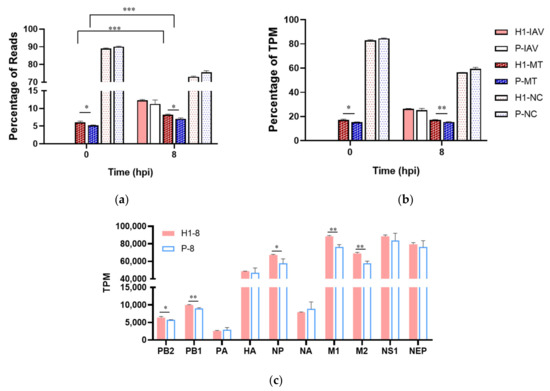 Enhanced expression level of five viral transcripts. (a) percentage of reads mapped to viral (IAV), mitochondrial (MT) and nuclear genome (NC). (b) percentage of total virus-coded, mitochondrion-coded, and nucleus-coded TPM. (c) mRNA level of IAV-coded genes at 8 hpi. Samples from triplicated infections were used for RNAseq data analysis. * p < 0.05, ** p < 0.01, *** p < 0.001.