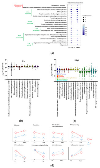 Dynamics of cell response to IAV infection. (a) Gene ontology enrichment analysis of host responses of H1 and P upon IAV infection; size represents the fold enrichment, color represents the FDR. Colors of clustered GO terms represents direction of change—red: up−regulated, green: down−regulated. (b) transcript ratio of H1 to P in enriched functional classes at 0 h. (c) transcript ratio of H1 to P in enriched functional classes at 8 hpi. (d) dynamics of enriched functional classes in IAV infection. The relative positions of H1 (red circle) and P (blue triangle) at 0 h and 8 hpi were located according to the GESA results in Figure 4(b,c) and Table S4. The dynamic changes from 0 h to 8 hpi were inferred either from the transcriptome analysis results (solid line) from GO and GSEA enrichment in Figure 4a and Tables S2 and S3, or by inference (dashed line). Samples from triplicated infections were used for RNAseq data analysis.