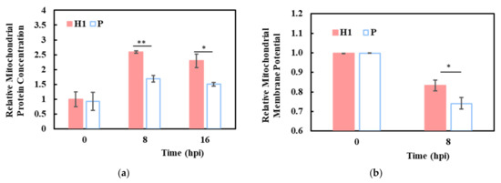 Elevated mitochondrial activities in H1 compared to P. (a) relative mitochondrial protein concentrations in H1 and P. (b) relative mitochondrial membrane potential in H1 and P. Experiments were done in triplicated infections. * p < 0.05, ** p < 0.01.