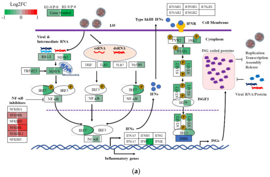 IAV infection elicits inflammatory and antiviral responses in the host cell; the responses were more vigorous in P than in H1. Antiviral activity is part of the cell’s innate immune response. Upon virus infection, the non-self RNAs are detected by RIG-I or TLRs, leading to the activation of downstream transcription factors IRFs and NFκBs and their translocation to the nucleus, where they trigger the production of interferons and inflammatory cytokines (Figure 6a). The secreted interferon binds to cell surface interferon receptors (IFNRs) and activates the JAK-STAT signaling pathway that leads to the synthesis of ISGs (interferon stimulated genes) [30]. These ISGs have important antiviral activities which inhibit various steps of influenza virus propagation [30,31,32]. The IRF7 (TPM = 63.21 ± 4.78) and the upper stream genes were mostly downregulated in H1 compared to P at 8 hpi. Many genes in the NFκB network and components of NFκB1 and NFκB2 were expressed at lower transcript levels (green, q < 0.05) in H1 than P, whereas most of the NFκB inhibitor genes were at higher levels in H1 (red; Figure 6a and Table S5).