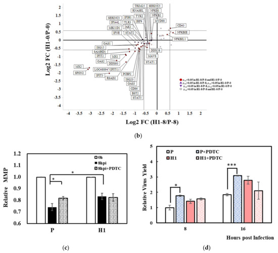 Reduced defense response to virus in H1 compared to P. (a) comparison of gene expression level of H1 and P in innate immune response against IAV infection at 0 h and 8 hpi. Each box represents a gene, different colors represent the Log2FC of H1/P (red: upregulated with padj < 0.05, green: downregulated with padj < 0.05, white: padj > 0.05 or average TPM < 1), colors shown in the left of the box represent the comparison at 0 h; in the right they right represent the comparison at 8 hpi. Diagram adapted from Chen, et al. [30] (b) comparison of expression levels of anti−viral genes or ISGs in H1 and P before and after virus infection (purple triangle represents genes with padj < 0.05 in comparison H1–0/P–0, inverted triangle represents genes with padj < 0.05 in comparison H1–8/P–8, red circle represents genes with padj < 0.05 in both comparisons). (c) effect of PDTC addition in H1 and P on mitochondrial membrane potential. (d) effect of PDTC addition in H1 and P on specific virus yield. Experiments were done in triplicated infections. * p < 0.05, *** p < 0.001.