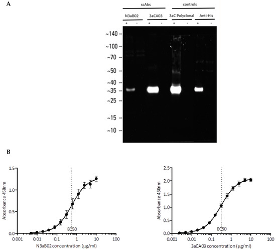 The antigen binding activity of soluble scAbs produced in a bacterial expression system was confirmed by ORF3a peptide binding ELISA. Interestingly, only N3aB02 and 3aCA03 scAbs bound to the full length ORF3a (MW ~35 kDa) in a transfected cell lysate western blot (Figure 1A). The EC50 values (half maximal binding response) of N3aB02 and 3aCA03 scAbs to their peptide antigens were estimated at a respectable 0.58 μg/mL and 0.31 μg/mL respectively (Figure 1B).