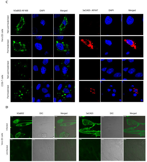 The ORF3a N terminus is predicted to be protruding extracellularly, while the C terminus is retained within the cytoplasm [11]. Fluorescence microscopy revealed that the N3aB02 scAb binds to ORF3a transfected cells, either permeabilized or non-permeabilized, confirming the extracellular location of the antibody binding region (Figure 1C). 3aCA03 scAb binding was confined to the intracellular domain of ORF3a since the staining was only observed when the cells were permeabilized (Figure 1C). Both N3aB02 and 3aCA03 scAbs bound to SARS-CoV-2 infected Vero E6 cells (Figure 1D).
