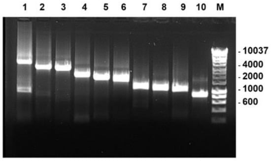T7 full-length PCR products corresponding to genome segments 1–10 of BTV-1 (lanes 1–10) analysed by 1% agarose gel electrophoresis. These PCR products were used for in vitro transcription with T7 polymerase. Lane M: DNA size marker labelled in base pairs (bp).