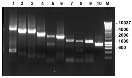Agarose gel electrophoresis analysis of the pGEX-4T-2 plasmid clones containing the Figure S1. of BTV-1RGC7 (lanes 1–10). Lane M: DNA size marker labelled in bp.