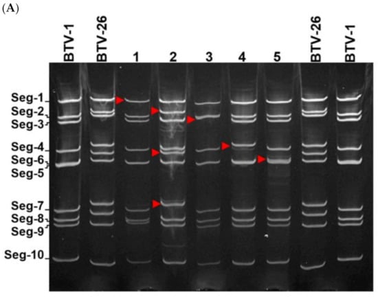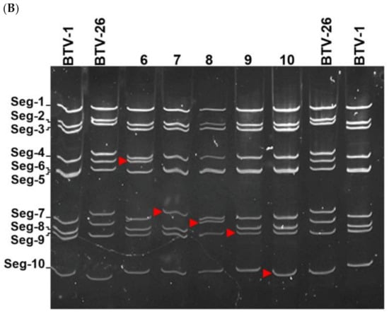 Analysis of the electropherotypes of the 10 reassortants of BTV-26 in BTV-1 backbone in 7.5% polyacrylamide gel. Segments derived from BTV-26 are indicated by a red arrow. (A) shows the electropherotypes of BTV-1RGC7 and BTV-26, as well as RGBTV1:1(26) in lane 1, RGBTV1:2,6,7(26) in lane 2RGBTV1:3(26) in lane 3, RGBTV1:4(26) in lane 4 and RGBTV1:5(26) in lane 5. (B) shows the electropherotypes of BTV-1RGC7 and BTV-26, as well as: RGBTV1:6(26) in lane 6, RGBTV1:7(26) in lane 7, RGBTV1:8(26) in lane 8, RGBTV1:9(26) in lane 9 and RGBTV1:10(26) in lane 10.