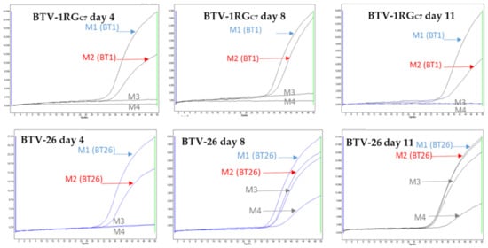 Real-time RT-PCR amplification curves of RNA extracts from blood samples of animals inoculated with BTV-1RGC7 or BTV-26 (M1 and M2 are the mice inoculated with the virus. M3 and M4 are the in-contact mice).