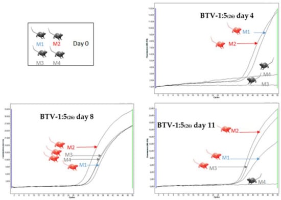 Real-time RT-PCR amplification curves for RNA extracts from blood samples of mice inoculated with BTV-1:5(26). On day 4 both inoculated mice (M1 and M2) are positive by real-time RT-PCR. On day 8 and 11, both in-contact mice (M3 and M4) were positive for BTV RNA. In one of the experiments, one in-contact mouse (M4) became negative on day 11 of the experiment.