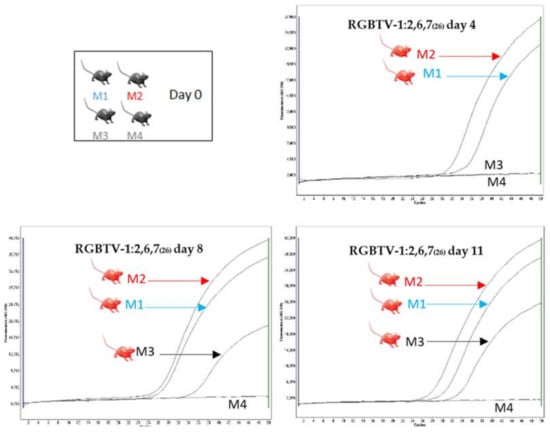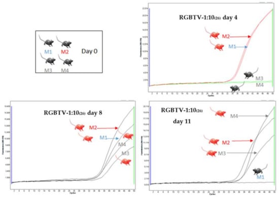 Real-time RT-PCR amplification curves of RNA extracts from blood samples of mice inoculated with BTV-1:10(26). On day 4 both inoculated mice (M1 and M2) were positive by real-time RT-PCR. On day 8 and 11 both in-contact mice (M3 and M4) were positive for BTV RNA. In one of the experiments, one mouse (M1) which was inoculated on day 0, became negative on day 11 of the experiment.