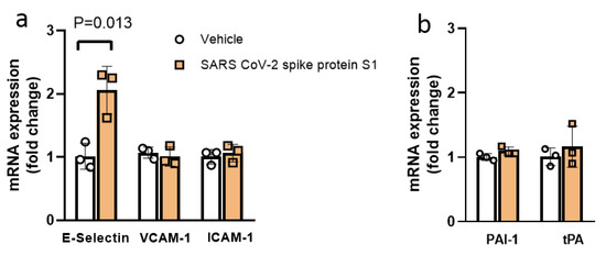 We investigated the effect of exposure to the S1 subunit of SARS-CoV-2 (S1) on endothelial injury in vitro by screening quantitative transcript expression levels of cell surface adhesion proteins [E-selectin, vascular cell adhesion molecule-1 (VCAM-1) and intercellular adhesion molecule-1 (ICAM-1)] and anti-fibrinolytic/fibrinolytic markers [plasminogen activator inhibitor-1(PAI-1)/tissue plasminogen activator (tPA)] in human aortic endothelial cells (ECs) in vitro. S1 exposure increased mRNA transcript expression of E-selectin 2.0-fold, as compared to vehicle (p = 0.013, Figure 1a). The transcript expression of VCAM-1 and ICAM-1 were not changed. The transcript expression of anti-fibrinolytic and fibrinolytic markers PAI-1 and tPA, respectively, were also not altered by S1 exposure (Figure 1b).