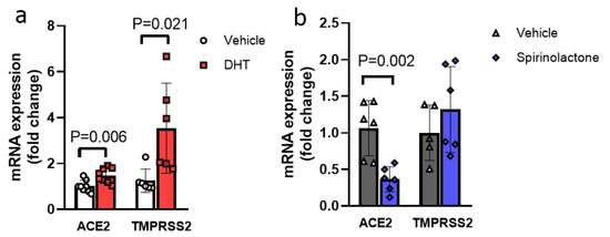 Effects of DHT and spironolactone on endothelial ACE2 and TMPRSS2 transcript expression in ECs. (a) DHT (500 nM) significantly increased ACE2 and TMPRSS2 transcript expression as compared to its vehicle. (b) Spironolactone (10 mM) treatment significantly reduced ACE2 transcript expression as compared to its control vehicle without affecting TMPRSS2 transcript expression in ECs in vitro (n = 6–8). Data were analyzed by two-sided unpaired t-test. p < 0.05 was defined to be statistically significant. All data are expressed as mean ± s.d.