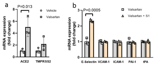 Angiotensin receptor blockade did not exacerbate S1-mediated EC injury in ECs. (a) Angiotensin receptor blockade with valsartan (10 mM) significantly increased in vitro EC ACE2 transcript expression without affecting TMPRSS2 expression as compared to the vehicle control. (b) In the presence of valsartan, S1 (25 nM) significantly increased the transcript expression of cell surface adhesion molecule E-Selectin, while VCAM-1 and ICAM-1 were not affected. In vitro EC transcript expression of the anti-fibrinolytic and fibrinolytic genes PAI-1 and tPA, respectively, were not affected by S1 exposure in the presence of valsartan. n = 3 in all groups. Data were analyzed by two-sided unpaired t-test. p < 0.05 was defined to be statistically significant. All data are expressed as mean ± s.d.