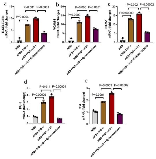 Co-treatment of ECs with S1 and TNF-α enhanced transcript expression of cell adhesion and anti-fibrinolytic/fibrinolytic genes, while spironolactone treatment blocked these effects. (a) Transcript expression of cell adhesion molecule E-selectin was increased by TNF-α alone (5 ng/mL) as compared to its control ARB (angiotensin receptor blocker, valsartan) and expression of E-selectin was further enhanced by S1 (25 nM) in the presence of TNF-α. (b,c) VCAM-1 and ICAM-1 transcript expression were also significantly enhanced by co-treatment of spike protein + TNF-α, as compared to TNF-α. (d,e) Transcript expression of anti-fibrinolytic and fibrinolytic genes PAI-1 and tPA, respectively, were upregulated by TNF-α, and their expression were further increased by S1 in the presence of TNF-α. Spironolactone (10 mM) markedly reduced both cell adhesion (E-selectin, VCAM-1 and ICAM-1) and anti-fibrinolytic and fibrinolytic PAI-1/tPA genes, respectively, in ECs in vitro, n = 3 in all groups. ● (ARB), ■ (ARB+TNF-α), ▲ (ARB+TNF-α+S1), ▼ (ARB+TNF-α+S1+Spironolactone). Data were analyzed by the analysis of variance (ANOVA). p < 0.05 was defined to be statistically significant. All data are expressed as mean ± s.d.