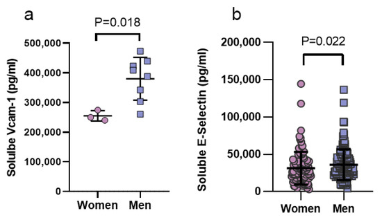 Sex differences in the circulating endothelial injury markers in patients with COVID-19. (a) Circulating VCAM-1 protein was significantly elevated in men (n = 7) as compared to women (n = 3) affected by COVID-19. (b) Men (n = 136) displayed higher circulating E-Selectin as compared to women (n = 106) in COVID-19. Data were analyzed by Mann-Whitney test between two groups. p < 0.05 was defined to be statistically significant. All data are expressed as mean ± s.d.