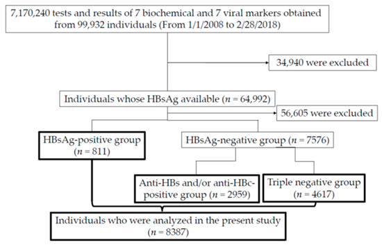 Of them, 64,992 patients were confirmed for HBsAg status. Further, we divided the patients into three groups as follows: 1. HBsAg-positive; 2. HBsAg-negative but anti-HBs and/or anti-HBc-positive; and 3. triple-negative (negative for HBsAg, anti-HBs, or anti-HBc) groups (Figure 1). A total of 8387 individuals were analyzed in the present study (Figure 1).