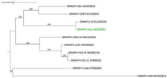 Figure 1. Evolutionary relationship of SfMNPV isolates with completely sequenced genomes. The newly described SfMNPV from Africa (SfMNPV-KA1) [111] is represented in the figure with a green font. The maximum likelihood phylogeny is shown. Numbers indicate maximum likelihood bootstrap values (1000 replicates). The scale bar represents 0.001 expected substitutions per site. Methodology: Whole genome sequences were obtained from GenBank (see accession numbers in the Figure). Both SfMNPV-ColA and SfMNPV-459 contain a region starting near the 3′ end of the chitinase gene until the 5′ end of the gp37 gene that seems to be acquired by recombination from another alphavirus species (closest match to Spodoptera litura NPVII, EU780426; see Popham et al. [79]. This region was excluded from both isolates (position 21642 until 24292 for SfMNPV-ColA; position 21621 until 24276 for SfMNPV-459). Sequences were aligned using MAFFT version 7 with default settings [147]. PAUP* version 4.0a [148] was used to select the optimal evolution model by critically evaluating the selected parameters [149]. Maximum likelihood analysis (heuristic search, 1000 bootstrap replicates) was performed in PAUP, using a submodel of the General Time Reversible Model with invariable sites and a gamma distribution of among-site rate variation (GTR + I + G) with rate class ‘abcdea’.