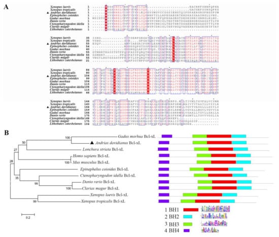 Sequence alignment was performed using CLUSTALW (https://www.genome.jp/tools-bin/clustalw, accessed on 2 February 2021), and images were generated using ESPript 3.0 (http://espript.ibcp.fr/ESPript/cgi-bin/ESPript.cgi, accessed on 2 February 2021). The phylogenetic analysis was performed using the neighbor-joining algorithm of MEGA 6.0 [26]. Motifs were predicted using Multiple Em for Motif Elicitation (MEME, https://meme-suite.org/meme/, accessed on 22 January 2021). The accession numbers of selected Bcl-xL proteins from the National Center for Biotechnology Information Reference Sequence database (http://www.ncbi.nlm.nih.gov/RefSeq/, accessed on 2 February 2021) are as follows: Mus musculus Bcl-xL, AAA51039.1; Homo sapiens Bcl- xL, CAA80661.1; Lonchura striata Bcl-xL, AAY42379.1; Xenopus laevis Bcl-xL, AAI10791.1; Danio rerio Bcl-xL, NP_571882.1; Ctenopharyngodon idella Bcl-xL, AXF53966.1; Clarias magur Bcl-xL, KAF5903480.1; Xenopus tropicalis Bcl-xL, BAB62748.1; Lithobates catesbeianus Bcl-xL, ACO51639.1; Trachemys scripta elegans Bcl-xL, ACQ42286.1; Epinephelus coioides Bcl-xL, AYA72661.1; Gadus morhua Bcl-xL, ACZ62647.1.