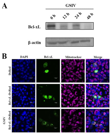 Following GSIV infection, the level of the Bcl-xL protein was reduced at 12 h post infection (hpi), increased at 24 hpi, and was finally suppressed at 48 hpi (Figure 2A). After overexpression, AdBcl-xL proteins were demonstrated to distribute irregularly in the cytoplasm of normal GSM cells, while they migrated to the mitochondria after GSIV infection (Figure 2B).