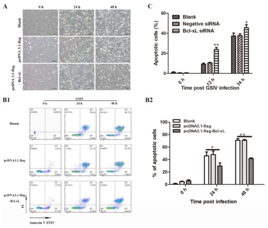 GSM cells were seeded into 12-well culture plates at 20 °C for 24 h and then transfected with pCDNA3.1-flag-Bcl-xL or pCDNA3.1-flag, as stated in Section 2.4, and cells treated with Lipofectamine™ 2000 were used as a blank control. After 48 h, cells were infected with GSIV (MOI = 0.5). At 0, 24, and 48 h post infection, the cells were harvested and washed with PBS. The cells were then suspended in 210 µL staining solution containing annexin V-fluorescein isothiocyanate (FITC) and propidium iodide (PI; Beyotime) and incubated at room temperature for 20 min in the dark. After washing, the fluorescence signals were determined using a FACScan flow cytometer (Beckman Coulter, Indianapolis, IN, USA). FlowJo software (Beckman Coulter) was used for flow cytometric analysis.
