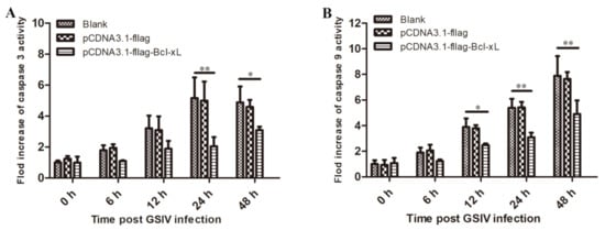 Caspase activity of normal GSM cells, pCDNA3.1-fla-transfected GSM cells, and pCDNA3.1-flag-AdBcl-xL-transfected GSM cells induced by GSIV infection at the indicated time points. Caspase-3 (A) and caspase-9 (B) activities were determined using fluorescein-active caspase-staining kits in a fluorescence plate reader. Error bars represent the mean ± SD; * p < 0.05, ** p < 0.01.