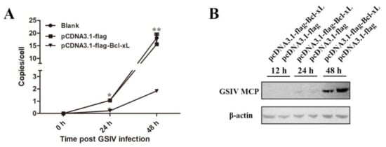 Effect of AdBcl-xL overexpression on the GSIV major capsid protein (MCP). (A) MCP gene copies in normal GSM cells, pCDNA3.1-flag-transfected GSM cells, or pCDNA3.1-flag-Bcl-xL-transfected GSM cells as detected using ddPCR at 6, 24, and 48 h post GSIV infection. (B) Proteins were extracted from GSM cells transfected with pCDNA3.1-flag-Bcl-xL and pCDNA3.1-flag at 0, 24, and 48 h post GSIV infection and analyzed by Western blotting. β-actin was used as a reference. * p < 0.05, ** p < 0.01.