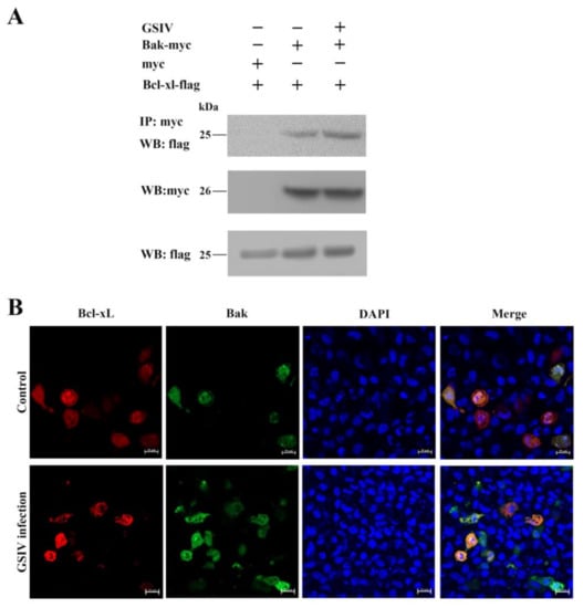 A co-IP assay was used to detect the interaction between the antiapoptotic molecules AdBcl-xL and the proapoptotic protein AdBak. AdBcl-xL was found to interact with AdBak (Figure 6A). Moreover, after GSIV infection, the interaction between AdBcl-xL and AdBak became stronger. These results were confirmed using confocal microscopy observation (Figure 6B).