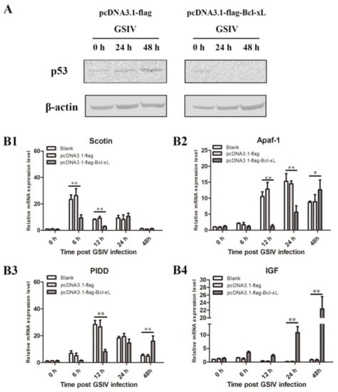 For p53 expression detection, protein samples of pCDNA3.1-flag-Bcl-xL or pCDNA3.1-flag-transfected GSM cells infected with GSIV (MOI = 0.5) at different time points were prepared, as above. The protein samples were then subjected to Western blotting using an anti-p53 mouse antibody (CST, Danvers, MA, USA) at a dilution of 1:1000, and an anti-β-actin antibody (CST, Danvers, MA, USA) at a dilution of 1:2000.