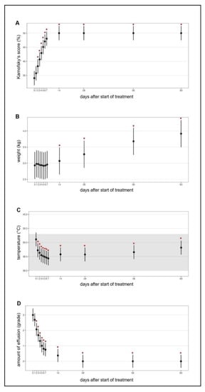Timeline visualizing improvement of clinical parameters throughout the study course. Figures show average predictive values and 95% confidence intervals of each parameter. Grey shading marks the reference ranges of the parameters. Red asterisks mark significant difference (p ≤ 0.05) of the parameters on different days of treatment when compared to day 0 (before treatment) measured by a linear mixed-effects model (for temperature) and by robust linear mixed-effects models. (A) Karnofsky’s score modified for cats. (B) Body weight. (C) Body temperature. (D) Amount of effusion subjectively evaluated during abdominal/thoracic ultrasound and paracentesis (grades 0 (no fluid) to 4 (massive effusion)).