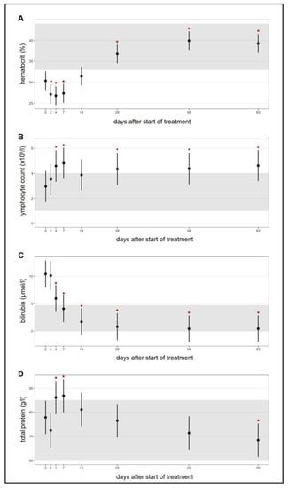 Timeline visualizing improvement of clinicopathological parameters throughout the study course. Figures show average predictive values and 95% confidence intervals of each parameter. Grey shading marks the reference ranges of the parameters. Red asterisks mark significant difference (p ≤ 0.05) of the parameters on different days of treatment when compared to day 0 (before treatment) measured by a linear mixed-effects model (for albumin) and by robust linear mixed-effects models. (A) Hematocrit. (B) Lymphocyte count. (C) Bilirubin concentration. (D) Total protein concentration. (E) Albumin concentration. (F) Globulin concentration. (G) Albumin/globulin ratio. (H) Serum amyloid A (SAA) concentration.