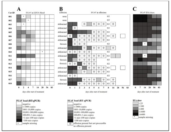 Feline coronavirus (FCoV) viral RNA loads in blood and effusion samples and serum anti-FCoV antibody titre measurements. (A) FCoV RNA loads in EDTA anticoagulated blood. (B) FCoV RNA loads in effusions. (C) Serum anti-FCoV antibody titres. FCoV RNA loads were determined by quantitative reverse transcriptase polymerase chain reaction (RT-qPCR) (A,B). Antibody titers were determined by indirect immunofluorescence assay (IFA). NT, not tested.