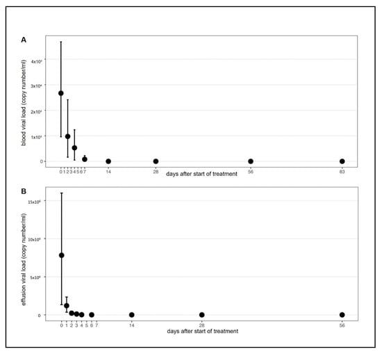 Viral load in blood and effusion throughout the study course. Figures show visualization of data using nonparametric bootstraps. (A) FCoV RNA loads in EDTA anticoagulated blood. (B) FCoV RNA loads in effusions.