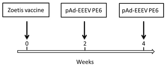 EEEV immunization scheme. Female BALB/c mice were i.m. primed with 100 µL/mouse of Zoetis vaccine at week zero and boosted with 100 µL/mouse of pAd-EEEV PE6 (100 µg) at weeks 2 and 4.