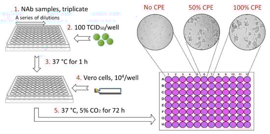 As shown in Figure 3, the alphavirus neutralization test (ANT) was carried out in 96-well plates. Three-fold serial dilutions of each NAb were screened, starting with a maximum concentration of 100 µg/mL. The volume of each well was 50 µL. Subsequently, 100× the 50% tissue culture infective dose (TCID50) of the virus in 50 µL was added to each well and then pre-incubated at 37 °C for 1 h to allow for neutralization of the virus. Thereafter, 1 × 104 cells/well (Vero) were added in a volume of 50 µL. Plates were then incubated at 37 °C under 5% CO2. After 3 days, the plates were examined microscopically. The NAb titer was identified as the highest dilution that resulted in 50% inhibition of CPE.
