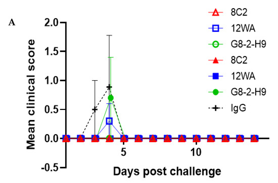 In a WEEV Fleming sublethal aerosol challenge model, all three anti-WEEV Nabs, either at a dose of 10 or 2.5 mg/kg, provided up to 100% protection (Figure 5). NAb 8C2 was able to provide 100% protection when mice were inoculated with either dose. The mortality rate of control mice did not reach 100% in this study due to the lower than anticipated exposure dose of WEEV (mean of 7.4 median lethal dose (MLD)). In addition to the mortality rate, it is important to note the differences in clinical outcomes, as all NAb-treated mice were free of clinical signs (ruffled fur, hunched posture, lack of mobility, behavioral changes, and weight loss) throughout the study. Statistical analysis (log-rank Mantel–Cox) using pairwise comparisons identified a significant benefit (p ≤ 0.05) in the prophylactic use of these anti-WEEV NAbs when compared with the non-specific IgG control group for 8C2 at either dose, 12WA at 10 mg/kg, and G8-2-H9 at 2.5 mg/kg (p = 0.034). Including both doses as stratification pairwise comparisons did not identify any significant differences between the anti-WEEV NAbs in this study (p ≥ 0.05), highlighting the ability of all three NAbs to provide protection against aerosol exposure. During the acute phase of infection, several mice succumbed to disease (the humane endpoint had been reached) and the viral load in the brain and lungs of these animals was determined. Mice inoculated with 10 mg/kg non-specific IgG that succumbed to disease on days 3–4 post aerosol exposure achieved mean titers of 6.05 × 109 pfu/g of WEEV Fleming in the brain and 1.05 × 102 pfu/g in the lung. The individual mice inoculated with 2.5 mg/kg 12WA and 10 mg/kg G8-2-H9 that succumbed to disease on day 4 post aerosol exposure were also found to have high viral loads in the brain (1.3 × 1010 and 4.8 × 109 pfu/g, respectively) and lung (3.6 × 107 and 6.9 × 105 pfu/g, respectively).