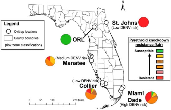 - Mundis, S.J.; Estep, A.S.; Waits, C.M.; Ryan, S.J. Spatial variation in the frequency of knockdown resistance genotypes in Florida Aedes aegypti populations. Parasites Vectors 2020, 13, 1–12. [Google Scholar] [CrossRef]